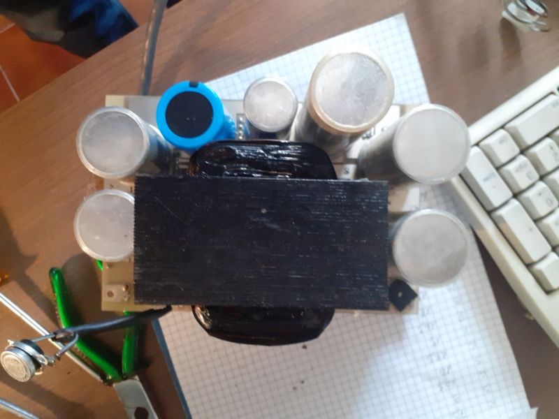 Finalmente mi ritrovo in mano il circuito stampato della sezione raddrizzatori e condensatori di livellamento. C'è un altro C.S. che contiene i regolatori veri e propri e si trova fissato sul retro, dove ci sono i transistor di potenza alettati.