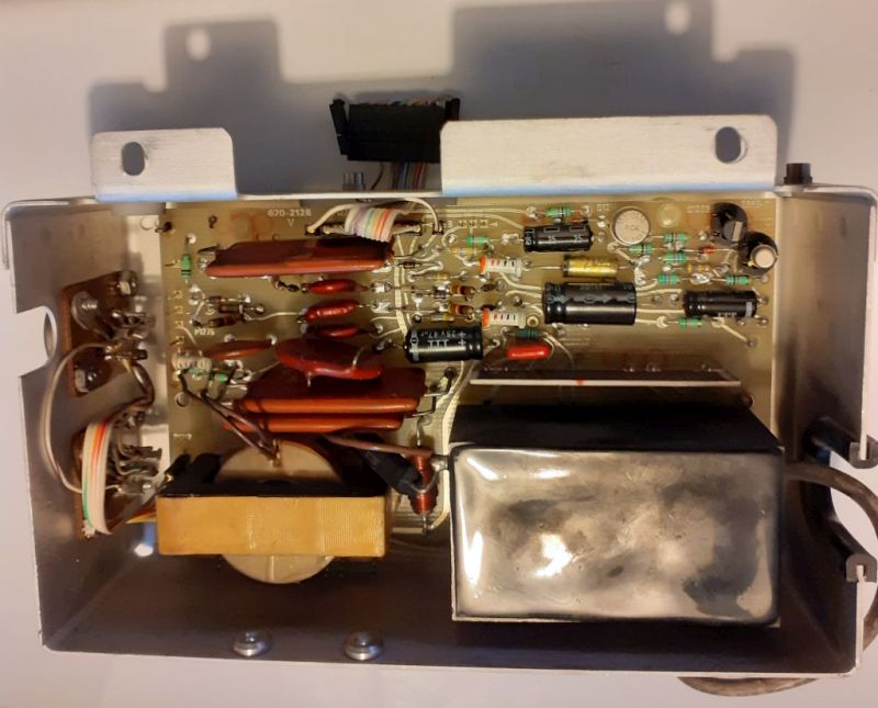 Lo strumento non dava segni di vita perchè erano bruciati sia il fusibile sulla linea 230 V sia un altro fusibile interno sulla linea di alimentazione dei +15 V verso lo switching che genera l'alta tensione (EAT) necessaria al funzionamento del CRT. Un rapido controllo dopo aver sostituito solo il fusibile sulla linea 230 V ha permesso di verificare che praticamente tutte le alimentazioni avevano un ripple elevatissimo, solito sintomo di condensatori elettrolitici esauriti. In questo modo, oltre a surriscaldare i vari regolatori (lineari, il 7603 non ha alimentatori switching) sicuramente si era sovrasollecitato anche l'oscillatore switching che pilota il trasformatore/elevatore che genera i 3 kV. Fortuna che c'era il fusibile interno, sullo stampato, a proteggere. Con tanta pazienza, mi sono rassegnato a estrarre il blocco alimentatore e smontarlo tutto.