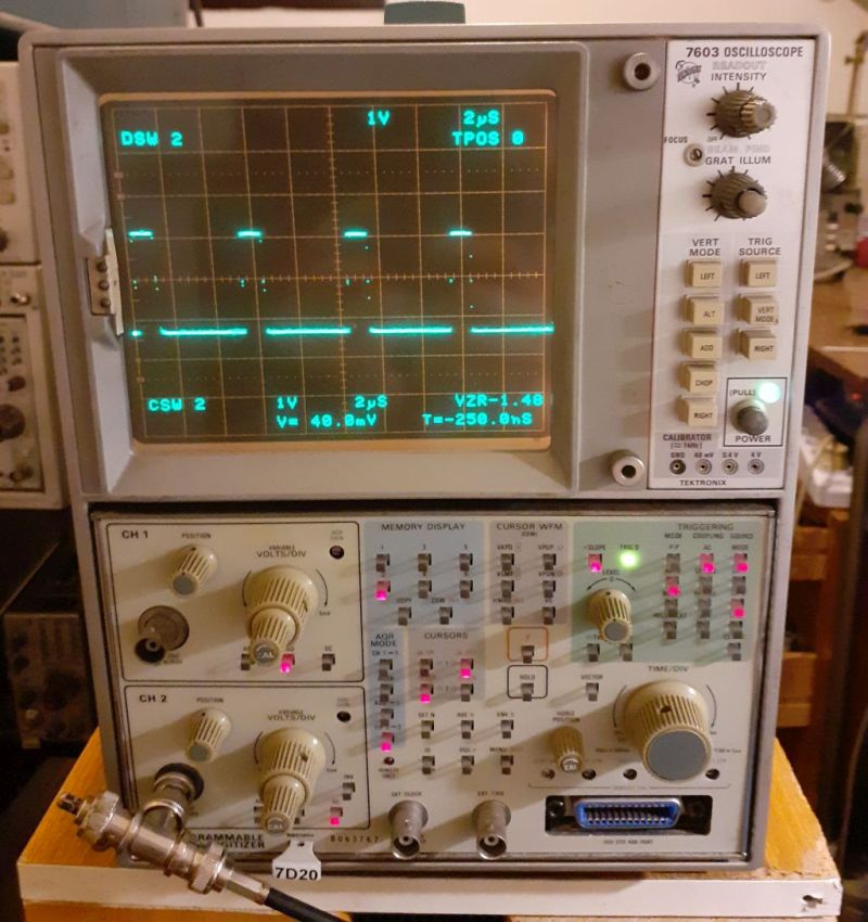 Giusto per togliere la curiosità a chi si chiede come facevano gli oscilloscopi della serie 7000 a mostrare il readout, ovvero le scritte in alto e in basso che mostrano le impostazioni dei V/div e sec/div come nella foto seguente: