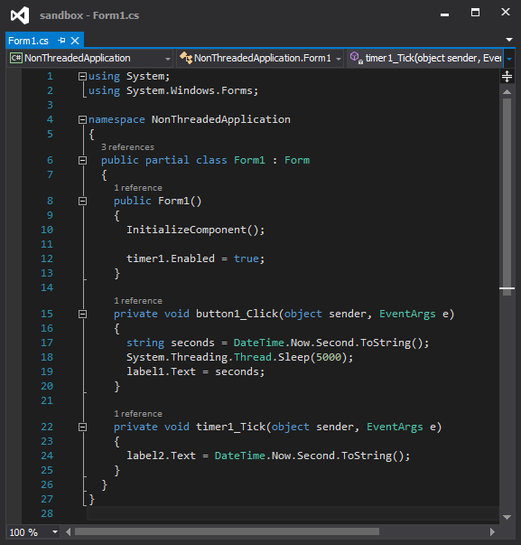 Il timer viene attivato all'inizializzazione della classe e a partire da quel momento genera 10 eventi al secondo. Questi vengono gestiti dall'event handler (timer1_Tick) che sovrascrive il testo di label2 con il numero di secondi dell'ora attuale. Quando si clicca sul bottone, viene chiamata l'altra funzione presente (button1_Click). Il numero di secondi viene memorizzato in una variabile, il thread va in sleep e dopo 5 secondi il valore memorizzato viene scritto in label1.