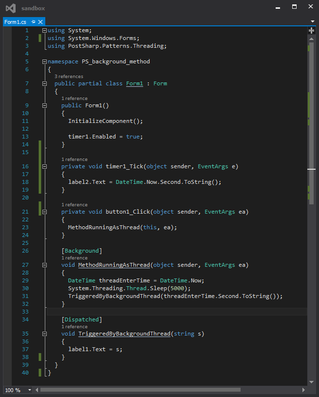 Normalmente avrei messo il codice del thread in un file cs separato. Ciononostante si tratta di parecchio codice per un'operazione abbastanza banale. La leggibilità del codice ne risente.