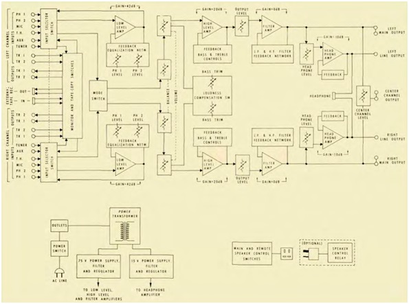 Devo dire che l'apparecchio, pur emanando un gran fascino per il suo stile vintage tipico degli anni '70 molto raffinato e al tempo stesso tecnologico, con un bellissimo schema a blocchi stampato e ben visibile sul coperchio superiore, per me è stata una delusione: dal punto di vista tecnico si sarebbe potuto fare di meglio, appare come un gran guazzabuglio di tecniche moderne (per quei tempi) e di tecniche arcaiche (sempre per quei tempi), inoltre contiene una miriade di commutatori e un andirivieni di segnali audio con tantissimi cavi schermati e tanti potenziometri di cui molti, secondo me, superflui.