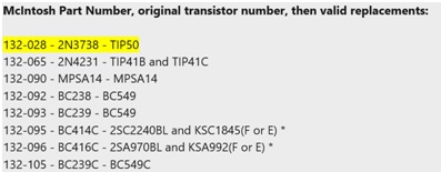 Si è quindi deciso di sostituire il transistor ma, poiché i codici usati nello schema elettrico per i transistor non sono quelli corrispondenti ai transistor ma sono dei McIntosh Part Number, si è fatta una ricerca in rete sul sito di Audiokarma trovando la seguente tabella: