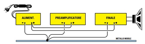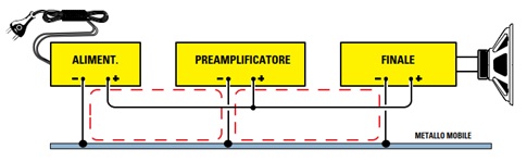 Il collegamento delle masse fra alimentatore e schede di preamplificazione, filtri, amplificazione, ecc. va effettuato secondo una tipologia denominata “Star Grounding”:
