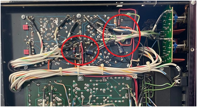 E’ stato rilevato che tutti i condensatori elettrolitici erano scarichi (circa 1/6 del valore nominale) e sono stati quindi sostituiti, scegliendo di posizionarli in aria (soluzione ritenuta più pratica e veloce) anziché aprire i tubi svuotarli e riempirli con i nuovi condensatori, soluzione più elegante ma molto più laboriosa.