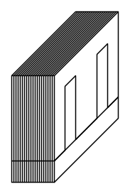 Questo lo si può verificare anche rapidamente: ricordando che la forma del nucleo deve essere quanto più possibile a sezione quadrata, lo spessore del pacco che formano i lamierini è di poco maggiore ad un terzo della lunghezza. Detto in altre parole, escludendo l'altezza del pacco, i restanti due lati stanno in una proporzione di circa un terzo. (Nella pratica poi i costruttori adottano anche sezioni un poco rettangolari per evitare di tenere in casa tutti i lamierini standard, quindi non deve preoccupare se nella misura delle dimensioni del pacco lamellare si trovano rapporti leggermente fuori da questa proporzione).
