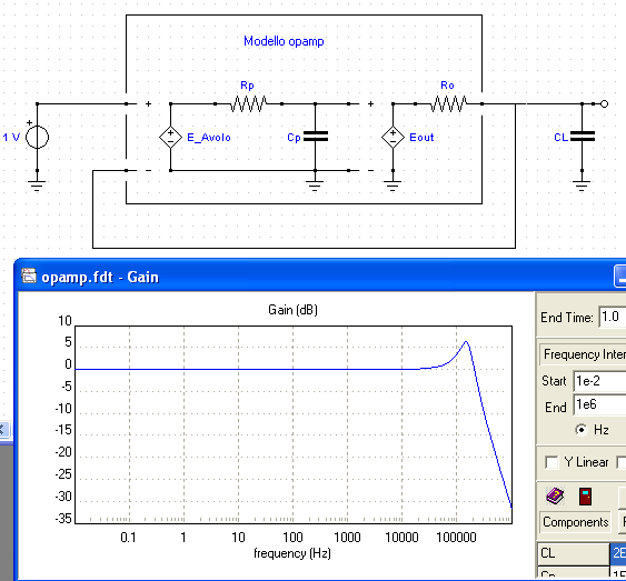 Vediamo ad esempio l'effetto della resistenza di uscita ad anello aperto e di un carico capacitivo su di un inseguitore di tensione.
