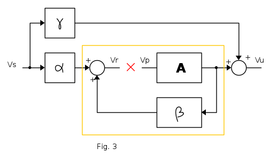 questa è invece una novità, rappresenta il leackage tra ingresso ed uscita con l'amplificatore A della catena diretta disattivato, direi che in un certo senso tiene di conto della non unidirezionalità del blocco β e del sommatore come definiti nella teoria classica della reazione.