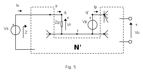 Colleghiamo un generatore di tensione di test VS e facciamo coincidere il nodo "q" con l'ingresso della rete e far poi confluire tutti gli altri rami -eccetto quindi il solo collegamento a VS- sul nodo "q' ".