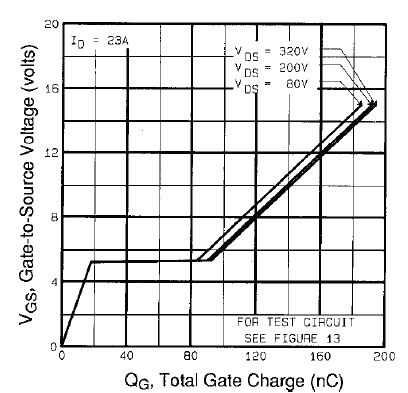 Il grafico di Fig.4 riportato dal datasheet del IRFP360 mostra la carica totale di gate, vediamo che ovviamente dipende dalla VGS e -un po' meno ovviamente- pure dalla VDS a causa dell'effetto Miller sulla capacità tra gate e drain ed infine -anche se non mostrato nel grafico- anche dalla corrente di drain che cambierà un pochino la tensione del plateau di Miller.