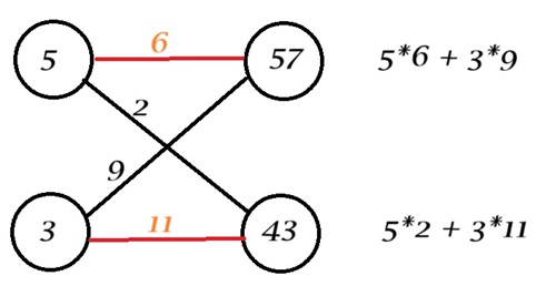 Si accoppia ogni elemento da entrambi i vettori in ordine, si moltiplicano e poi si sommano i numeri risultanti, quindi: