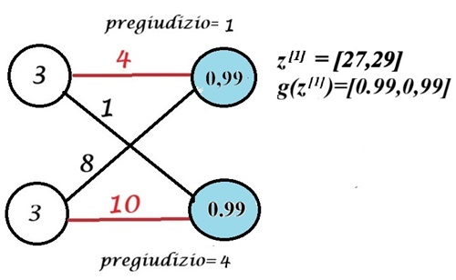 Una volta raggiunto l'ultimo livello L=3, otterrai l'output finale della rete: a[L]. Nota inoltre che tutti i nodi della rete avranno un valore compreso tra 0 e 1 a causa della funzione di attivazione sigmoide, che ci consente di creare test di probabilità.
