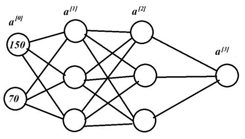 Poiché useremo questo campione di training come input per la nostra rete, e sappiamo di poter chiamare il livello di input anche livello 0-esimo, non dovremmo designare l'input [150, 70] come a[0]?