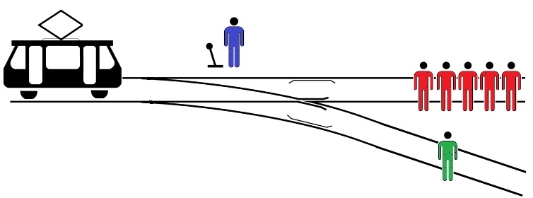 Una persona che si trova nelle vicinanze ha la possibilità di tirare una leva e deviare il treno su un altro binario, dove è presente una sola persona.