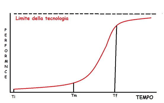 Sembra assodato che il ciclo di vita di una qualsiasi tecnologia si comporti con una curva ad S, lascio la sua descrizione ad un esame di economia, in questo contesto è importante notare che il punto Tf è normalmente il momento in cui interviene o un’altra tecnologia più performante o la tecnologia cessa di poter migliorare le sue performance e rimane tale nel tempo non interessando più investimenti e ricerca.