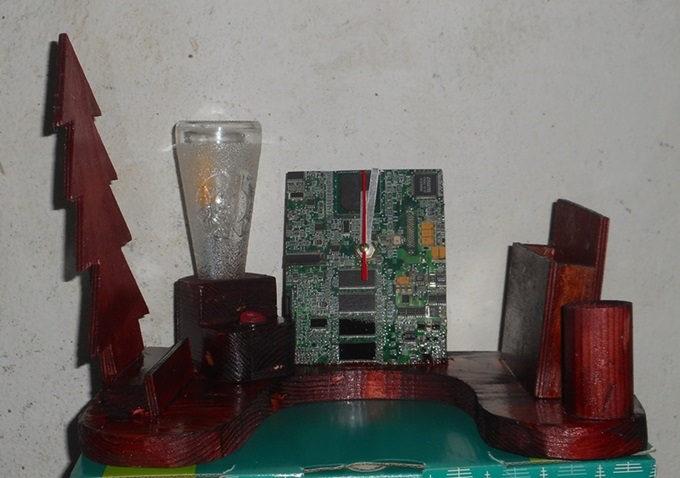 - Un orologio ricavato da una scheda di un vecchio computer. La scheda è stata tagliata alla misura voluta ed incollata su una base in modo che sia stabile. Non ho riportato i numeri delle ore, mi sembrava di snaturare la scheda, e l’ora si valuta benissimo anche senza le cifre del quadrante.Un piccolo contenitore di foglietti per appunti, tipo post-it.