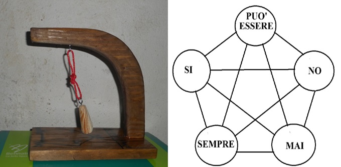 Dalla foto del manufatto si vede chiaramente che si tratta di un pendolo sospeso su una tavola dove sono incise ai vertici di un pentagono (figura magica) delle risposte ad una domanda posta della persona che opera.