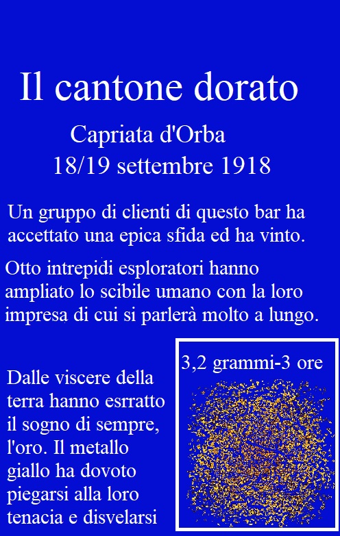 Io fui sicuramente il primo ad arrivare al bar il 20 marzo, un venerdì. Avevo con me il cartello, preparato nella notte su cui avevo incollato le pagliuzze di oro trovato e avevo sintetizzato la narrazione della nostra impresa.