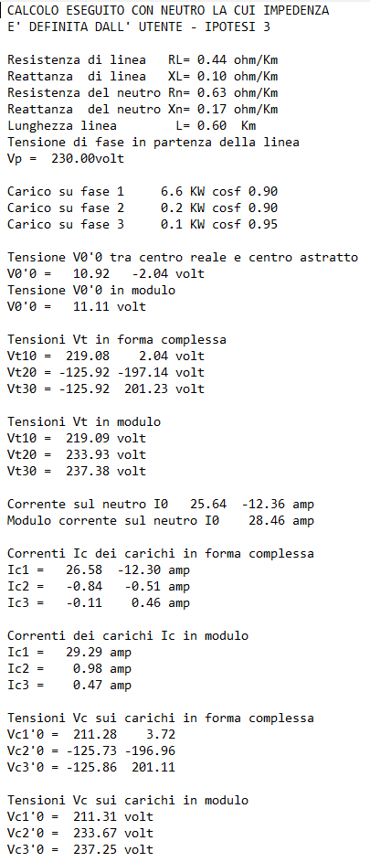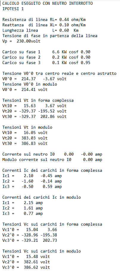 Il programma salva nella stessa cartella ove è installato il file Risultati.txt che si riferisce alle 3 ipotesi considerate riguardo la condizione del neutro.
