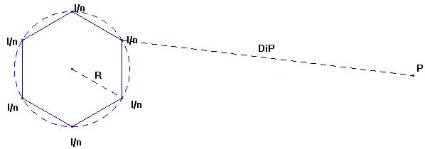 I conduttori disposti lungo la circonferenza di raggio R vedono transitare una corrente pari a I/n. Facciamo un'ipotesi fondamentale: il punto P fino al quale si vogliono calcolare i flussi concatenati è a distanza molto grande rispetto alle distanze reciproche dei conduttori. In questo modo si possono considerare le distanze tra ogni singolo subconduttore e P in prima approssimazione uguali.