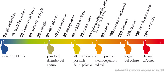 Il piacere acustico, oltre che dalla musica, trae origine anche dalla distribuzione dei suoni/rumori dell’ambiente naturale, quali il canto degli uccellini, lo scorrere di un ruscello, lo stormire delle fronde e molti altri; anche le voci delle persone che ci sono care o simpatiche sono fonte di piacevolezza … Per contro il disturbo nasce sia dal tipo sia dal livello energetico del fenomeno acustico: se il livello (volume) sale troppo può raggiungere la cosiddetta “soglia del dolore” e addirittura danneggiare l’orecchio, talvolta in modo irreversibile. Ma senza arrivare a questo, un elevato volume può creare un disagio dovuto a eccesso di stimoli acustici, variabile a seconda della costituzione timbrica, durata e distribuzione nel tempo.