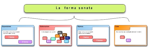 Noi sentiamo parlare spesso di “sonata” come nome di un pezzo per pianoforte o per altri strumenti, ad esempio la Sonata “Al Chiaro di luna”, ma bisognerebbe distinguere tra il periodo fino a metà ‘700, in cui la “sonata” era una forma monotematica in due parti, e il periodo dopo metà ‘700, quando si diffuse, soprattutto ad opera di Johan Christian Bach (uno dei figli di J.S. Bach), la cosiddetta forma-sonata. Si tratta di uno schema compositivo che prescrive in una prima parte (Esposizione) l’uso di due temi (ossia due motivi musicali) in due tonalità diverse, tonica e dominante; segue una seconda parte (Elaborazione) in cui i due temi vengono sviluppati e arricchiti eventualmente da altri elementi; una terza parte (Ripresa) riprende la prima, variandola di poco, con i due temi nella stessa tonalità ed è seguita da una “coda” conclusiva. I due temi dovevano essere non molto diversi tra loro, in modo da non creare contrasti troppo forti. Oltre alle “Sonate” vere e proprie, la forma-sonata trova impiego in molte composizioni, quali sinfonie, concerti per strumento solista e orchestra, quartetti, trii, etc.