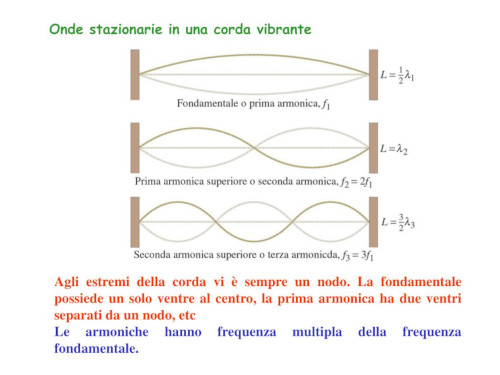 - Corda tesa (lunghezza L): la risonanza avviene quando la frequenza di oscillazione della corda corrisponde a una delle sue frequenze naturali, producendo onde stazionarie con nodi e ventri ben definiti lungo la lunghezza della corda: λ=2*L/n, n=1,2,3,…. La condizione ai bordi è opposta rispetto al tubo aperto: qui lo spostamento è nullo agli estremi perché la corda è fissata.