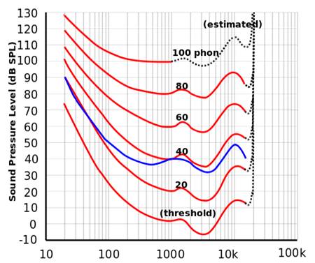 Fissato il livello sonoro in dBSPL a 2 kHz, ogni curva è distanziata dalla precedente di 10 dB a quella stessa frequenza: per 40 dBSPL a 2 kHz passa la curva dei 40 phon; le curve isofoniche distano tra loro di 10 phon. A 2 kHz, phon e dBSPL hanno lo stesso valore, mentre si vede che andando verso le basse frequenze le curve si avvicinano, perché l’orecchio diventa sempre meno sensibile e quindi a parità di phon il livello sonoro deve aumentare. Partendo dalla curva più bassa e salendo, ogni curva rappresenta un incremento di sensazione del “doppio di volume sonoro” definito come incremento di 10 phon (o raddoppio dei "son"); ciò significa che, almeno nelle frequenze intorno ai 2 khz, per ottenere un raddoppio di volume sonoro occorre aumentare di 10 dB, ossia di 10 volte la potenza acustica e, nel caso di un altoparlante, 10 volte la potenza elettrica.