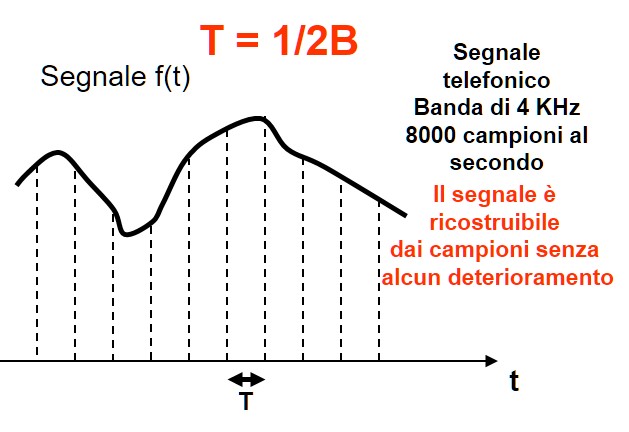 Ogni segnale fisico ha una banda di frequenze limitata e pertanto può essere rappresentato in modo perfetto anche solo con una successione di campioni prelevati ad intervalli di tempo uguali (teorema del campionamento). Il segnale telefonico, ad esempio, ha una banda convenzionale di 4 KHz e quindi bastano 8000 campioni al secondo per rappresentarlo in maniera fedele. Se poi volessimo aumentare la fedeltà di un segnale acustico, dovremmo tenere conto che il nostro orecchio non percepisce suoni oltre i 15 KHz e quindi sarebbe inutile prelevare più di 30000 campioni al secondo da un segnale il cui utilizzatore finale fosse l’orecchio umano. Questo fenomeno è ben noto anche ai bambini quando scoprono che si può simulare il movimento facendo scorrere tra le dita un pacchetto di immagini fisse, una leggermente diversa dall’altra. E’ il “gioco” del cinematografo. Il nostro occhio infatti non è in grado di percepire come separate nel tempo immagini che si susseguono a velocità troppo elevata (è un filtro passa-basso) ed infatti i quadri del televisore cambiano ad una frequenza di 25 al secondo. Il movimento viene ricostruito con una sequenza di immagini fisse, di “campioni” del movimento.