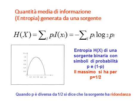 Una sorgente è caratterizzata dalla quantità media di informazione generata per ogni simbolo. A questa media Shannon ha dato il nome di Entropia della sorgente. Nel caso della sorgente binaria si vede che l’entropia al massimo vale 1 bit quando i simboli sono equiprobabili ed in caso contrario si dice che la sorgente è ridondante, cioè ogni simbolo binario prodotto fornisce meno informazione di quanto potrebbe.