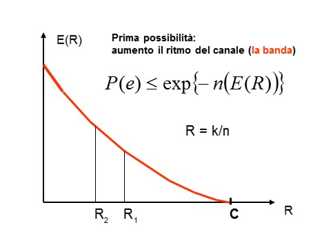 La probabilità di errore del sistema diminuisce esponenzialmente per l’effetto di due fattori: la lunghezza del codice di canale n ed una funzione E(R) il cui andamento tipico si vede nella figura,