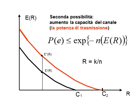 Seconda possibilità. Posso aumentare la potenza del segnale trasmesso, con ciò riduco la probabilità di errore sul canale e ne aumento la capacità ottenendo un valore maggiore per E(R).
