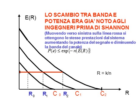 Queste due possibilità, come abbiamo già accennato, erano ben note a tutti gli ingegneri delle telecomunicazioni. La funzione E(R) descrive il meccanismo già noto dell’uso della banda e della potenza del segnale come risorse trasmissive ed eventualmente del loro scambio.