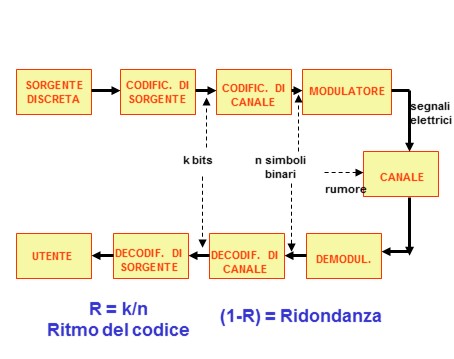 Abbiamo detto che le sorgenti di solito sono ridondanti. Il problema è che la loro ridondanza è fuori dal nostro controllo perché non ne conosciamo bene la struttura matematica. Conviene allora eliminarla con il codificatore di sorgente. Il suo compito è quello di sostituire, mediante opportuni algoritmi, la sequenza di simboli binari non equiprobabili della sorgente con un’altra sequenza nella quale i simboli siano il più possibile equiprobabili (nel caso ideale lo saranno). Sarà compito del decodificatore di sorgente, al terminale di ricezione, di ricostruire la sequenza originaria perché naturalmente gli è noto l’algoritmo di codifica. In tal modo però la sequenza dei k simboli di informazione da trasmettere sono molto vulnerabili a causa degli errori del canale; ma noi sostituiamo la sequenza di k simboli con una più lunga, di n simboli binari (abbiamo aggiunto una ridondanza pari a 1-k/n), usando il codificatore di canale.