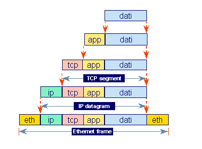 Come si vede dalla figura ogni gruppo di dati di un protocollo di un certo livello (o strato/layer) è “payload” per lo strato inferiore, che vi aggiunge la propria intestazione (dati di servizio), fino a formare il pacchetto completo che viaggia sulla linea.