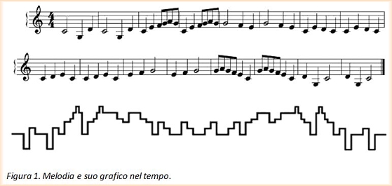 Meno nascosti (ma non sempre palesi, anzi) sono gli aspetti costruttivi delle composizioni e in particolare dei trattamenti delle melodie. Un metodo di rappresentazione grafica cartesiana del tipo y=f(x) di una melodia si rivela utile per scoprirne alcune caratteristiche a colpo d’occhio. Nell’asse x si riporta il tempo, mentre sull’asse y si riporta l’altezza della nota (che in realtà sarebbe la frequenza, o meglio il suo logaritmo in base 2 a voler essere pignoli): una melodia quindi dà luogo a una successione di segmenti orizzontali lunghi quanto la durata di ciascuna nota.