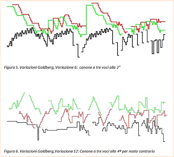 Le figure mostrano la rappresentazione di due canoni tratti dalle Variazioni Goldberg di Bach: dai grafici risultano chiare le traslazioni nel tempo di due voci. Nel secondo grafico la seconda voce è invertita, oltre che traslata, rispetto alla prima.