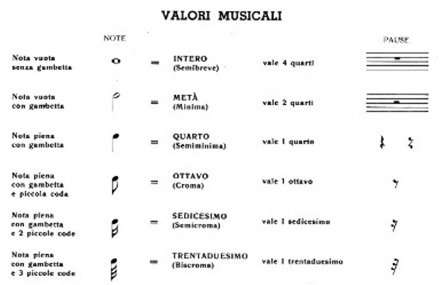 Oltre a quella delle altezze, cruciale è la strutturazione delle durate, fondata sulla suddivisione in potenze di 2 di un intervallo temporale arbitrario detto intero o 4/4, che funge da unità di misura. E’ però un’unità di misura “non standard” perché la sua durata è del tutto arbitraria, indicata sommariamente dall’indicazione di velocità: Allegro, Andante, Adagio, etc. L’unica regola è che si mantenga uguale a se stessa finché non compare un’indicazione di velocità diversa. Volendo essere più precisi si può usare il metronomo, una sorta di pendolo che batte il tempo con dei “tac-tac”: la frequenza dei “tac” è in battiti al minuto; quindi “60” corrisponde a 1 secondo tra un tac e il successivo. A questo intervallo temporale è associata la durata di una delle “figure musicali temporali”, che sono tutte legate tra loro tramite le potenze di 2 e si chiamano anche valori musicali.