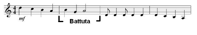 La battuta si chiama così perché segna anche il ritmo: a ogni suo inizio si “batte il tempo”, con un suono più forte (accento) o con un rumore, tipicamente quello percussivo di un tamburo. Nei secoli scorsi in molti casi il direttore teneva verticalmente un bastone e ne batteva la punta per terra; dalla prima metà dell’800 si diffuse l’uso della attuale bacchetta. (Il povero musicista Giovanni Battista Lulli o Lully, vissuto in Francia alla corte di Luigi XIV ma nato a Firenze nel 1632, si colpiva spesso il proprio alluce destro battendo il tempo per coordinare coro e orchestra: la ferita mai curata peggiorò sempre di più e, avendo lui rifiutato l’amputazione del dito, andò in cancrena e ne provocò la morte). Il ritmo più semplice è quindi quello segnato dall’inizio della battuta, mentre una melodia può occupare una parte di battuta oppure più battute. Da dopo il canto gregoriano, ossia dal XII secolo in poi, la melodia non è quasi mai più solitaria, ma è cantata o suonata insieme ad altre melodie (polifonia), oppure è accompagnata da suoni di strumenti musicali.