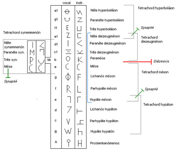 Naturalmente i Greci antichi avevano altri nomi per le note. Ogni nota ha un nome e una lettera che la rappresenta per i cantanti (vocal), mentre gli strumenti disponevano di altri simboli (instr). Il tutto è visibile nella figura sottostante, insieme ai nomi anglosassoni delle note.