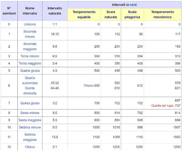 La tabella mostra l'ampiezza dei semitoni nelle tre accordature pitagorica, naturale e mesotonica 1/4 comma.