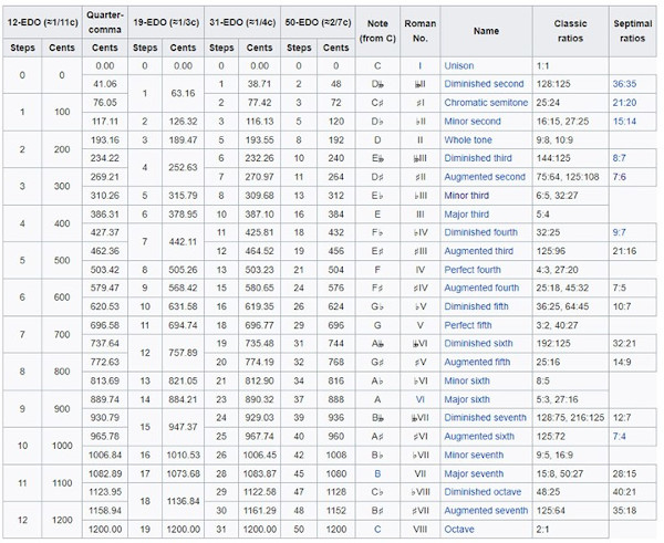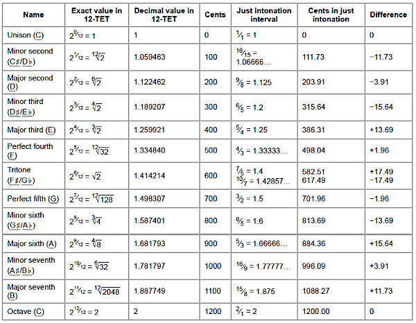 Nella tabella seguente, le dimensioni di vari intervalli giusti tratti dalla scala naturale vengono confrontate con le loro controparti del pari temperamento equabile.