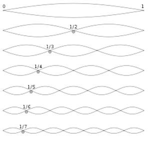 La figura mostra alcuni modi di oscillazione di una corda ideale che si manifestano tutti contemporaneamente e con varie intensità. La corda, per la sua elasticità, trasforma l’energia impulsiva ricevuta in energia oscillante. La propagazione dell'energia è possibile solo tra un estremo e l'altro: si crea quindi una situazione di equilibrio che si manifesta con onde stazionarie trasversali in cui si evidenziano "ventri" (posizioni in cui l'oscillazione è massima) e "nodi" (posizioni in cui l'oscillazione è = 0): è questo il fenomeno detto "risonanza". I nodi si trovano nelle posizioni risultanti dalla divisione per un numero intero (1/n). Il numero è intero perchè nasce esattamente dalla situazione di equilibrio suddetta, che corrisponde al minimo del movimento dell'energia.