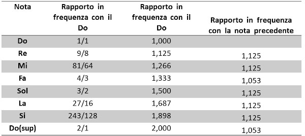 Il rapporto tra Fa e Mi e quello tra Si e Do(sup) si chiama “semitono” e vale (4/3)/(81/64) = (2/1)/(243/128) = 256/243 = 1,053. Dalla tabella si vede la posizione dei toni (9/8 = 1,125) e dei 2 semitoni (1,053).