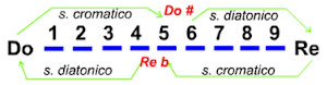 Abbiamo così sistemato le scale di Fa e di Sol, introducendo due nuove note, il Si bemolle (indicato con Sib) e il Fa diesis (indicato con Fa#). Viene subito da chiedersi: perché non iniziare la scala anche dalle altre note? Se per esempio inizio dal Re, devo constatare che mi serve il Fa# ma anche il Do#. Alla fine, dovrò disporre anche di tutte le note aumentate con il diesis. Quindi avrò 7 + 7 = 14 note in tutto, più il Si bemolle, in definitiva 15 note. Però posso chiedermi: se mi servono toni e semitoni e il semitono è la metà di un tono, qual è il numero massimo di semitoni che posso ottenere? Nella scala diatonica ci sono 5 toni e 2 semitoni, quindi posso ottenere solo altri 10 semitoni dividendo in 2 parti i 5 toni: in tutto avrò 12 semitoni e, visto che giunte all’ottava le note si ripetono, 12 note. Ciò significa che il Mi# deve coincidere con il Fa e che il Si# deve coincidere con il Do; inoltre il Sib deve coincidere con il La#. Da 15 note siamo tornati a 12. Non solo: poiché il # innalza la nota di un semitono e il b la abbassa di un semitono, anche il Mib deve coincidere con il Re# e così per tutte le altre note. Ossia una stessa nota, che nel pianoforte corrisponde a un tasto nero, ha un doppio nome. Per completezza, anche il Fa si può chiamare Mi# e il Mi si può chiamare Fab, il Do si può chiamare Si# e il Si si può chiamare Dob. Diesis e bemolli si chiamano "alterazioni" delle note. In Germania c'è un eccezione nel nome delle note: la nota B significa direttamente Sib mantre il Si naturale si chiama H; per le altre invece si usa il suffisso "moll" per indicare il bemolle. Un'altra differenza è che i paesi anglosassoni chiamano il diesis con il suffisso "sharp" (anche se il termine "diesis" esiste in inglese) e il bemolle con il suffisso "moll" mentre i tedeschi usano il suffisso "is" per il diesis e il suffisso "es" per il bemolle; così Fa# viene chiamato Fis, il Lab diventa Aes, etc.