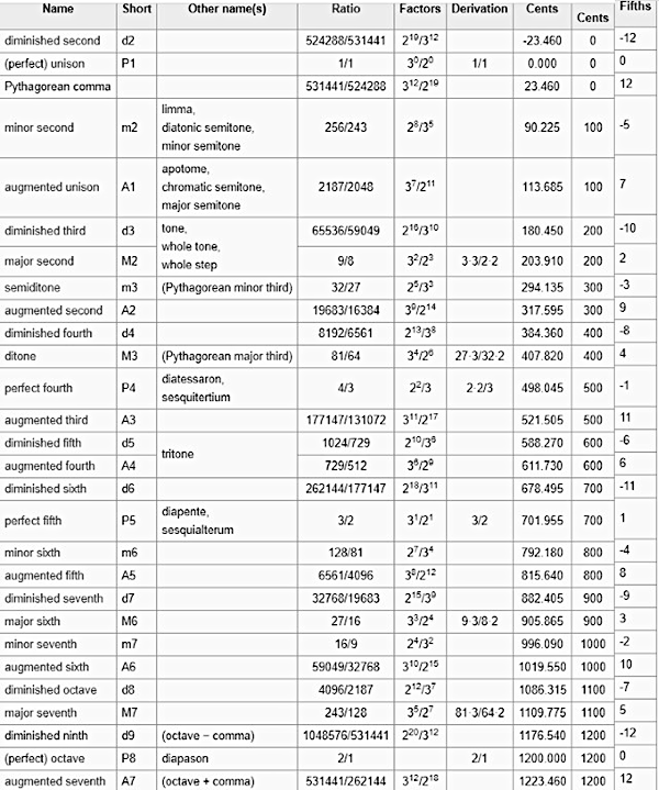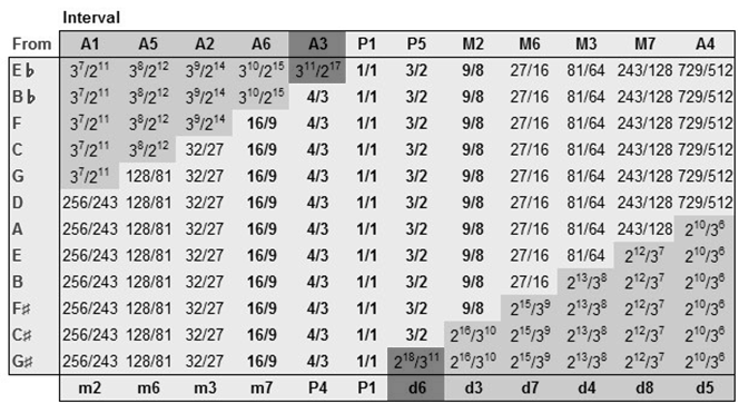 In grassetto sono gli intervalli "puri" (giusti o maggiori). Gli intervalli "del lupo" hanno sfondo grigio scuro.