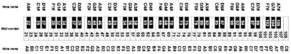 Tale suffisso è presente solo quando strettamente necessario, in pratica quasi solo nei discorsi teorici, perché la musica scritta sul pentagramma indica anche l’ottava di appartenenza. Le 88 note sono distribuite su poco più di 7 ottave: il Do1 è preceduto da La0 (la prima nota della tastiera del pianoforte, la più bassa di tutte in assoluto), da Sib0 e da Si0, mentre il Si7 è succeduto solo dal Do8 che è l’ultima nota della tastiera del pianoforte, l'ottantottesima. Le ottave in uso nella pratica musicale sono 7. Se partiamo dal Do più basso di tutti nella tastiera del pianoforte e lo chiamiamo Do1, l’ultimo tasto in alto è il Do8, nella figura C8 (che darebbe inizio all’ottava ottava ma, salvo casi particolari, non esiste un Re8). Tenendo come riferimento il La4 a 440 Hz come fondamentale (tale frequenza è uno standard internazionale dal 1953, ma fino ad allora variava notevolmente da un posto all’altro), il Do4 ha frequenza fondamentale 261,63 Hz e il Do1 ha 32,703 Hz, cioè 261,63/23. La nota in uso più bassa di tutte è il La0 e ha la fondamentale di 27,5 Hz cioè 440/24. Come si ricavano le frequenze fondamentali delle note a partire da una frequenza di riferimento lo vedremo più avanti.