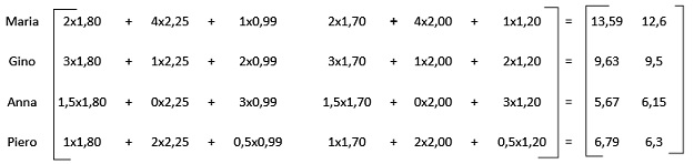 Si ottiene un vettore T spesa totale generale, ripartito tra le 4 persone, cioè un vettore le cui componenti nello spazio 4 dimensioni rappresentano la spesa totale di ciascuno. T = [13.59, 9.63, 5.67, 6.79]