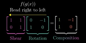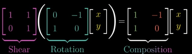La composizione che abbiamo rappresentato sopra non è altro che un prodotto di due matrici, in questo caso quadrate. Quindi applicare prima una trasformazione (espressa dalla matrice M1 “Rotation”) e poi un’altra (espressa da M2 “Shear”) corrisponde a fare il prodotto M2M1 = Composition; notare che bisogna procedere da destra verso sinistra. Che è diverso dal prodotto M1M2: ci se ne può convincere facilmente per via grafica.
