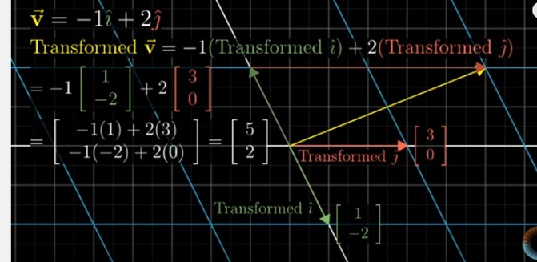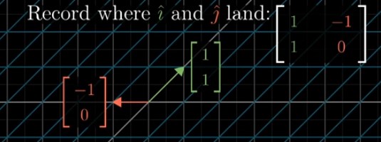 Per orientarsi meglio è utile tenere presente che [a c] è la trasformazione lineare del versore î nel versore Î e [b d] è la trasformazione lineare del versore ĵ nel versore Ĵ. In questo modo dovrebbe risultare chiaro che la trasformazione lineare espressa dalla matrice [a b, c d], quando applicata a un vettore generico [x, y], trasforma questo vettore in un altro vettore di coordinate [ax+by, cx+dy]. Queste coordinate sono espresse nel sistema di riferimento di partenza, quello che ha la base î = [1, 0] e ĵ = [0, 1]. Al tempo stesso, il nuovo vettore, risultato della trasformazione [a b, c d], si può interpretare come un vettore di coordinate “vecchie” [x, y] nel nuovo sistema di riferimento che ha base Î-Ĵ.